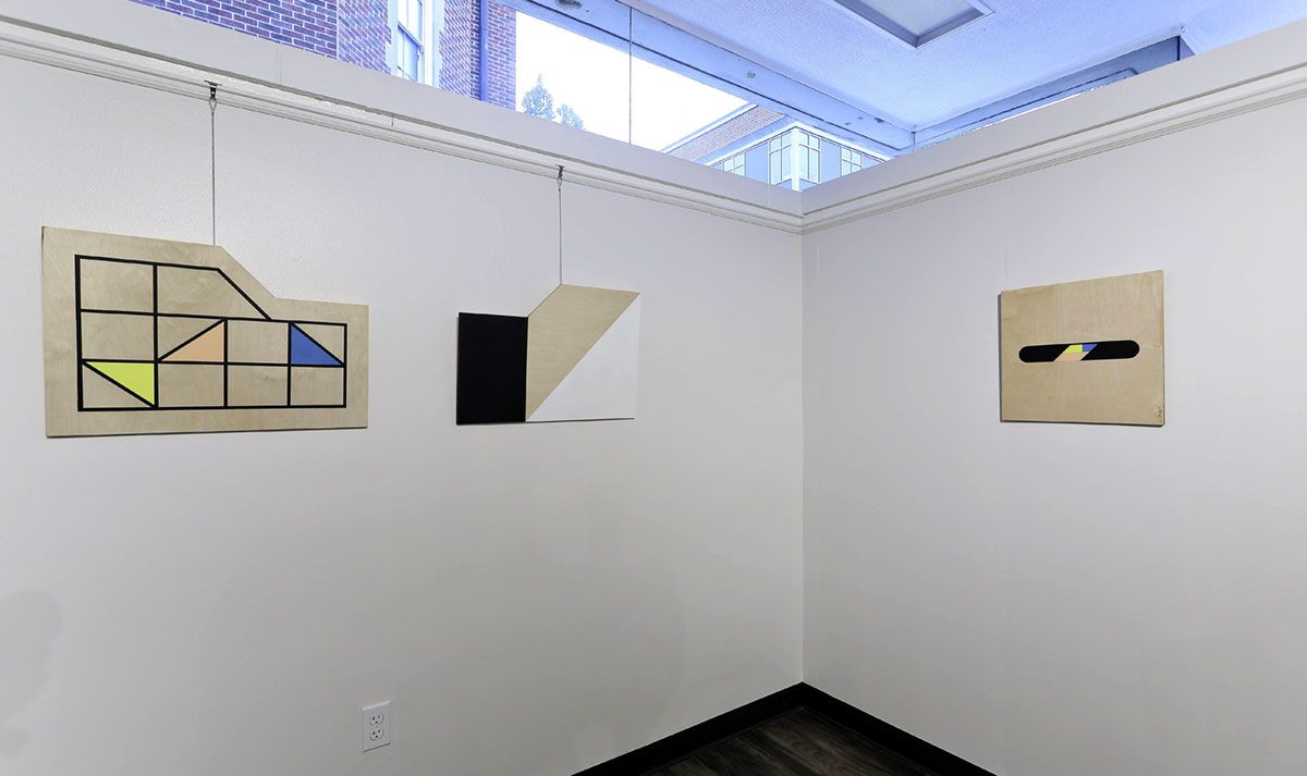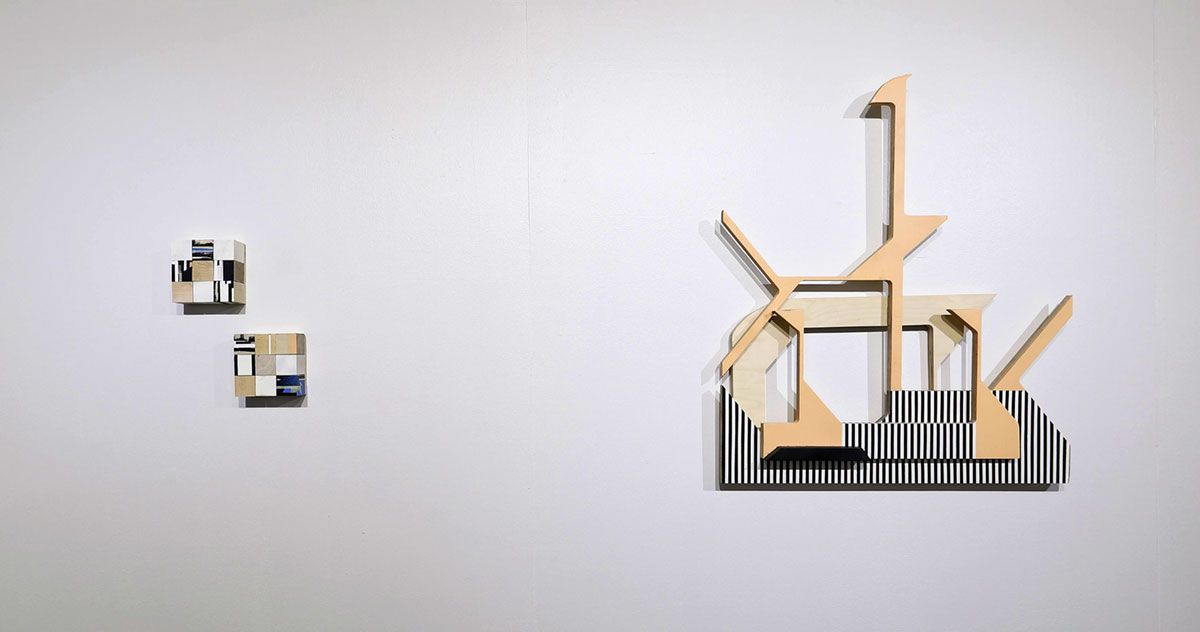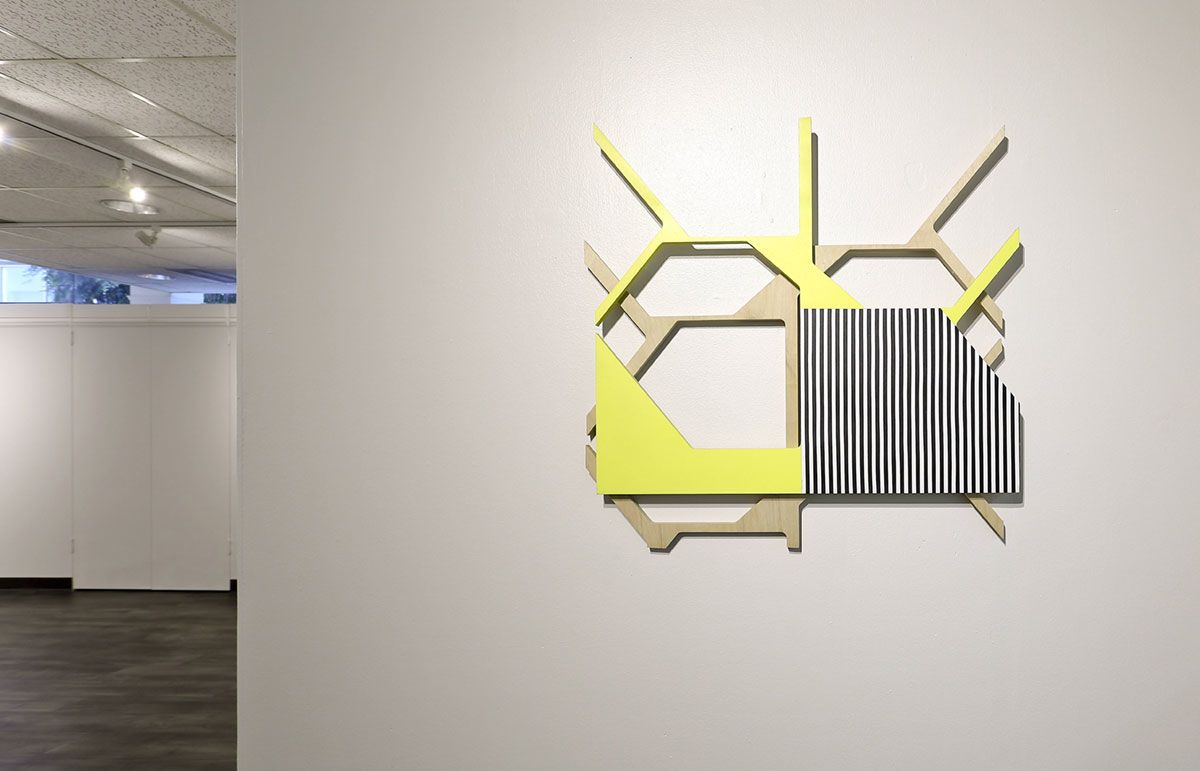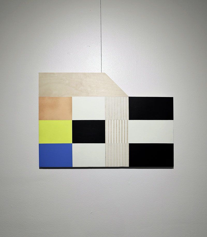 Artist’s Statement: “I rented a studio almost four years ago to dedicate myself to my art practice in a more intentional way. I decided wood would be a good medium to work with—it’s easy to find, utilitarian. I started by repurposing discarded home improvement pieces I found along the street in my neighborhood. I would use spray paint to embellish the pieces in simple striped patterns, playing with the balance of negative and positive space, and using tape to create a hard edge.