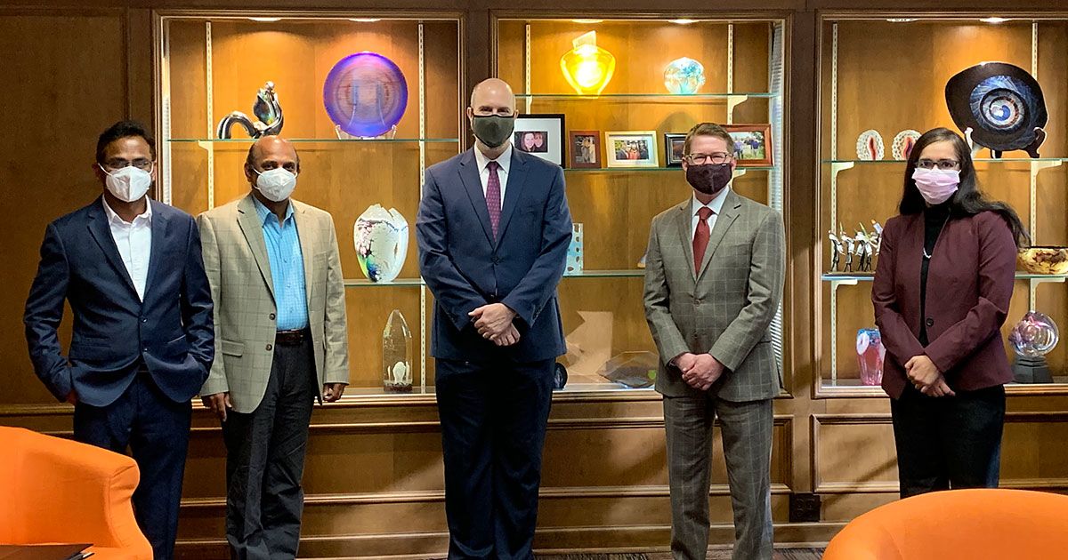 Pictured above (l-r): Bhupal Panga, CEO of the Indo-American Student Council; Dr. Kumar Annavarapu, Coordinator of Overseas Education for the state government of Andhra Pradesh; Dr. Paul Haught, CBU Vice President for Academics; Jack Shannon, President of Christian Brothers University; and Dr. Divya Choudhary, Director of Graduate Engineering and Dean of the College of Adult Professional Studies at CBU.