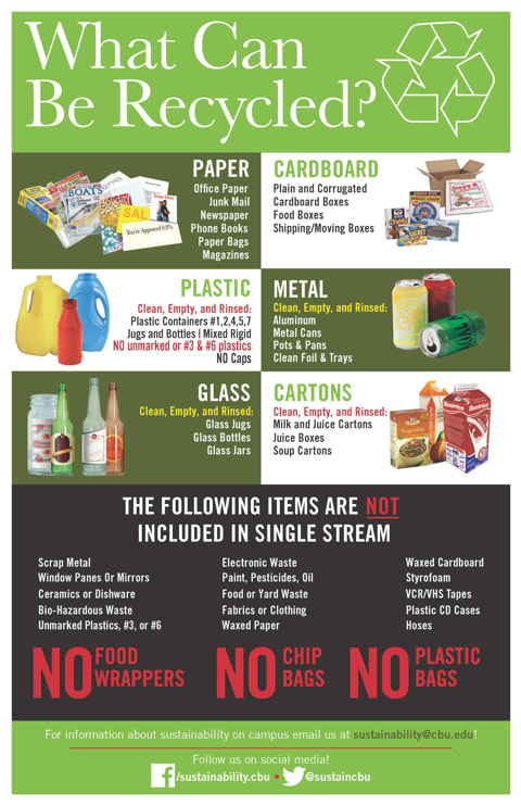 Recycling at CBU is done in partnership with ReCommunity. Since the program started in March 2011, CBU has recycled over 50 tons or 100,000 lbs of material. Collection is commingled (single-stream) and receptacles can be found in buildings throughout campus. They are typically located at the end of hallways near exits and stairwells.